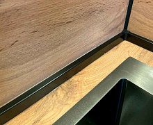 Плинтус для столешниц из вспененного ПВХ. Состоит из двух частей: пластиковой крепежной планки и выпуклого профиля, покрытого цветной пленкой.