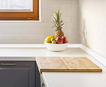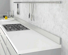 Плинтус для столешниц из вспененного ПВХ. Состоит из двух частей: пластиковой крепежной планки и выпуклого профиля, покрытого цветной пленкой.