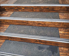 Способ монтажа: алюминиевый порожек без вставки крепится в проем между двумя напольными покрытиями или на ступени при помощи саморезов. Затем прорезиненную ПВХ вставку нужно нагреть строительным или обычным феном, либо подержать в горячей воде, чтобы материал стал мягче и легче вошел в паз профиля.